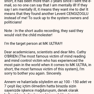 I also told my mother and aunt that I drank at least 100 - 150 pills and 7 types of medication and that I didn't die, in fact, I am a victim of torture and was used as a test subject, because of you, and in short, no one can say that you are mentally ill. Turkish audio recording is attached! I drank at least 100 - 150 pills and 7 types of medicine and I didn't die! First a human, then a scientist Prof. Selim ŞEKER and Prof. I sent an e-mail to Ismail Hakki AYDIN and they did not send me a reply e-mail saying that I am mentally ill! In short, it has been more than 3 years since I sent the e-mail, so no one can say that I am mentally ill! If they say I am mentally ill, it means they want me to die! It means that they found another Levent CENGIZOGLU instead of me! To suck up to the system owners and politicians!