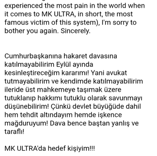 Eğer Cumhurbaşkanına hakaret davası için davaya katılmazsam ve kendi istediğim bir zamanda yani en azından önümüzdeki seçimler civarında (2 - 4 sene) yada sonrasında tutuklanırsam kısaca kendi isteğimle teslim olursam evlenmiş olacağım ve MK ULTRA davası açacağım yani işkence mağduru olduğumu belirten bir dava daha olacak ben hapishanedeyken!